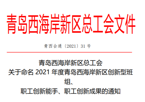 近日,青島西海岸新區(qū)總工會發(fā)布通知,公布“2021年度青島西海岸新區(qū)創(chuàng)新型班組、職工創(chuàng)新能手、職工創(chuàng)新成果”評選情況,公司工程技術(shù)研究中心榮獲新區(qū)創(chuàng)新型班組殊榮,該部門副主任呂靈靈、副主任工程師仉杰當(dāng)選新區(qū)職工創(chuàng)新能手。[ 查看更多 ]